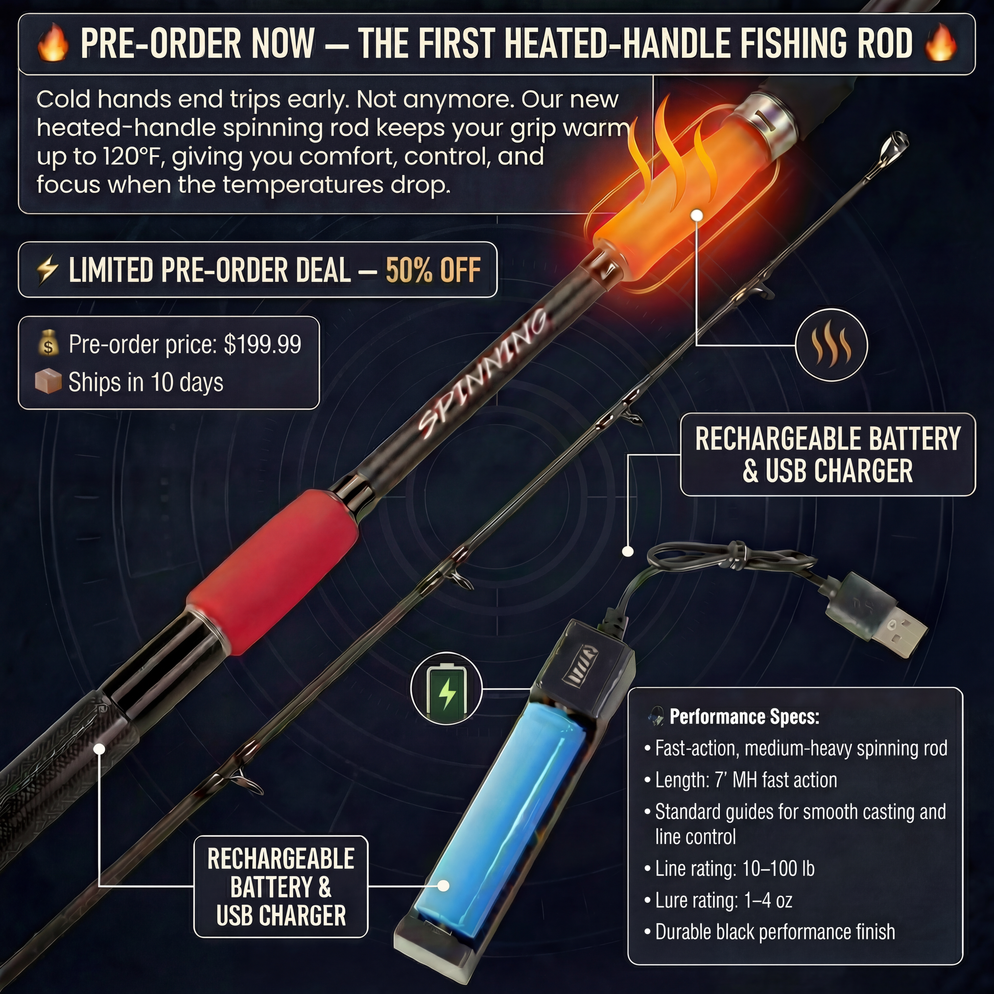 🔥 Heated Handle Technology — fish longer in cold ocean conditions